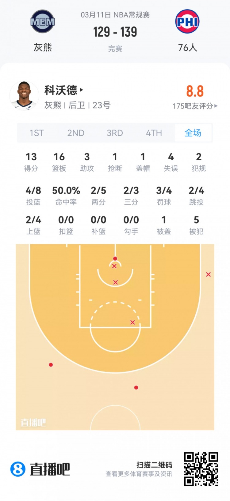 灰熊首轮11号秀科沃德 登场23.8分钟
