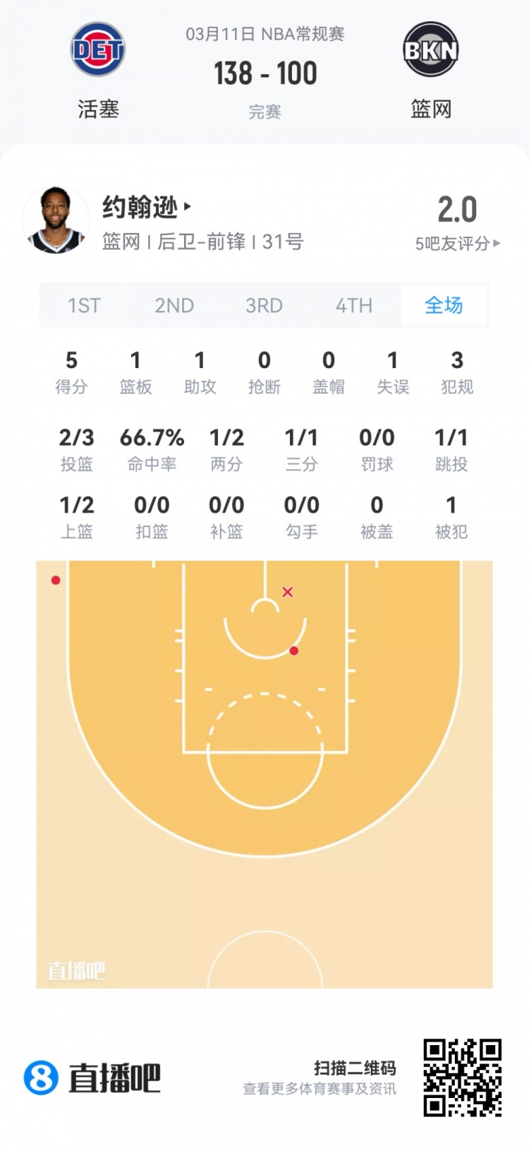 篮网首轮19号秀特拉奥雷 登场16分钟