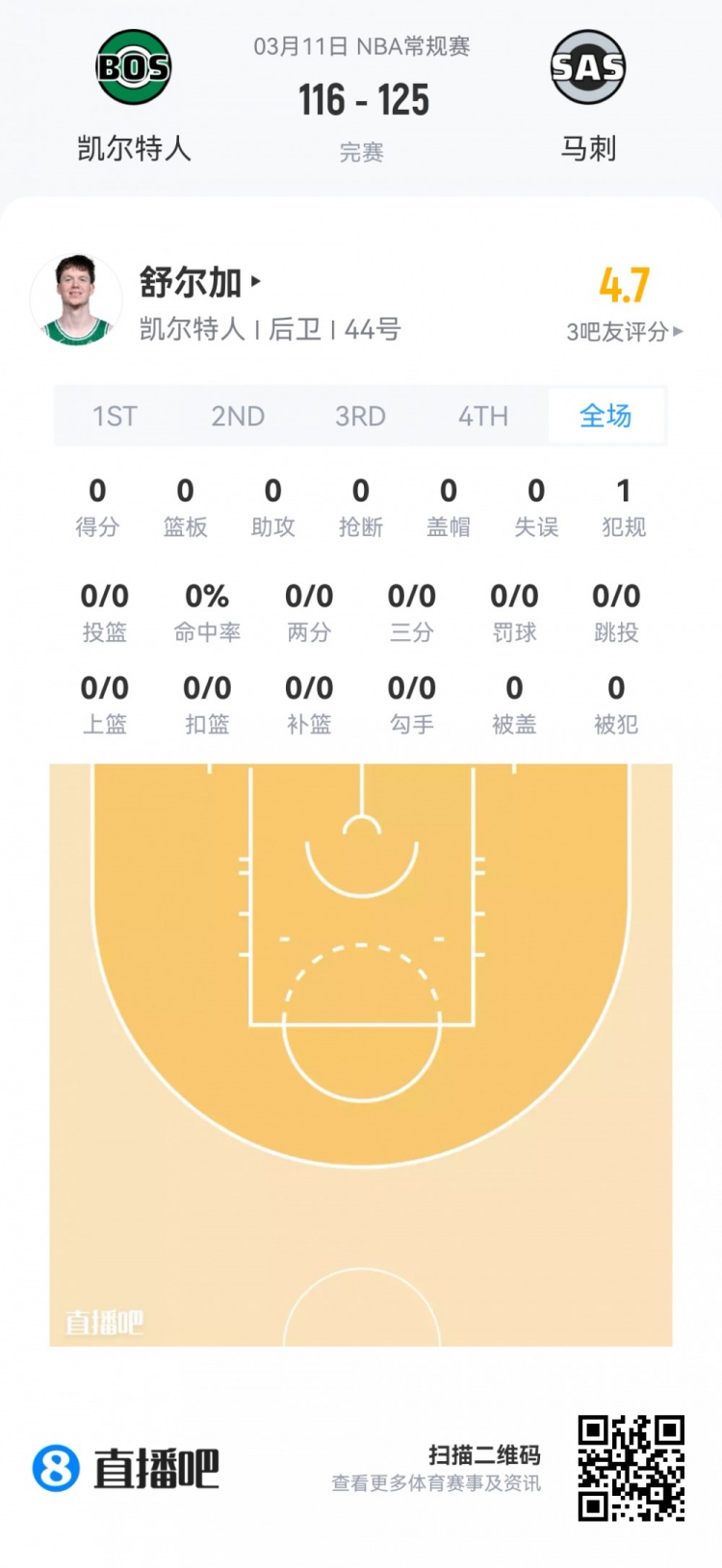凯尔特人次轮57号秀马克斯·舒尔加 登场0.9分钟