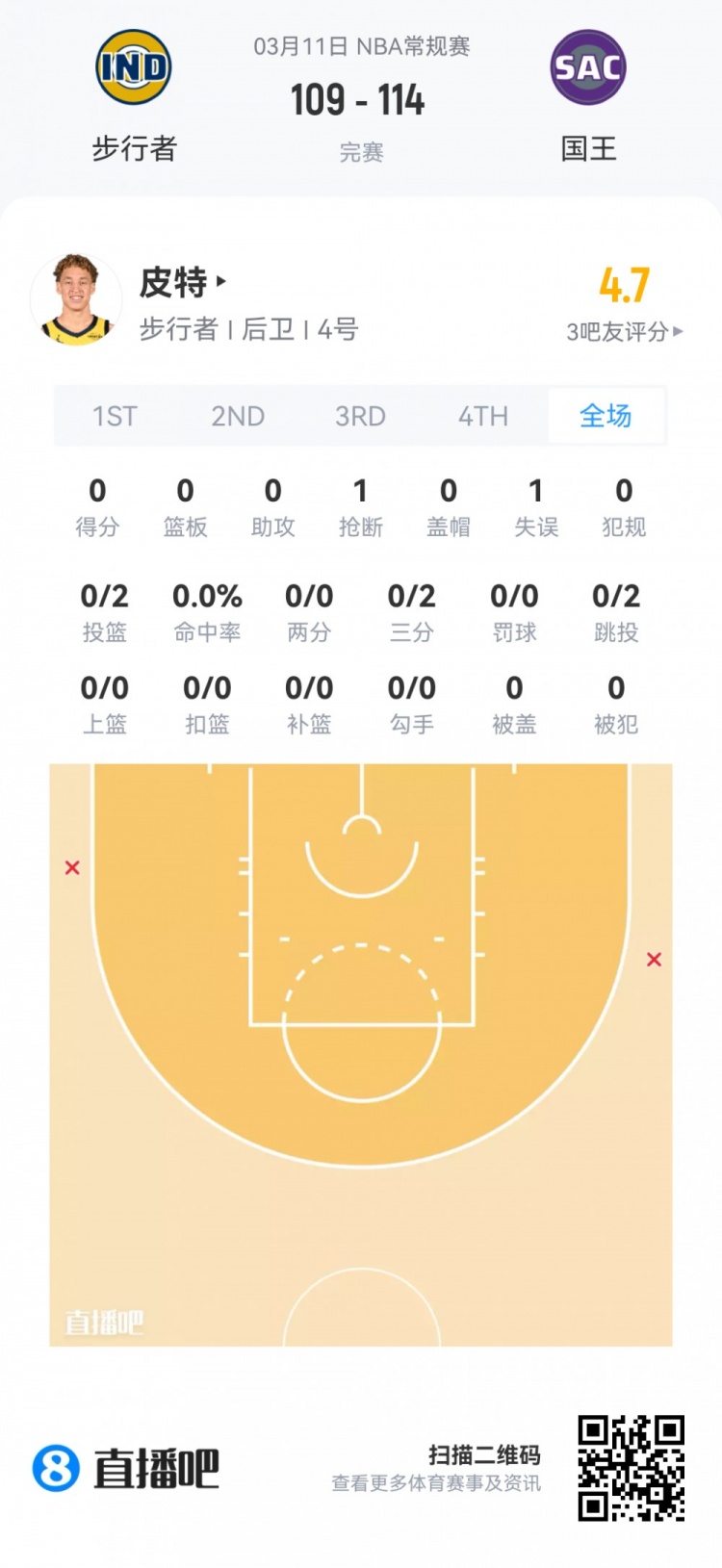 步行者次轮54号秀泰伦·皮特 登场4.8分钟